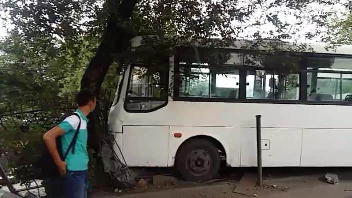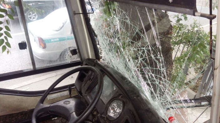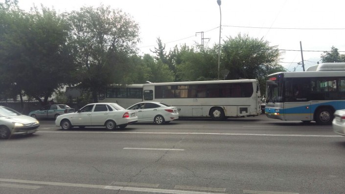 В этот момент водитель 133-го маршрутного автобуса, ехавший по Райымбека в восточном направлении, не заметил, что автобус 11-го маршрута стоит с включенными аварийными сигналами, резко попытался вырулить вправо и врезался в магазин по продаже памятников. Пострадал водитель. Его госпитализировали. Из пассажиров никто не пострадал. Стоит отметить, что аварии случились на автобусной полосе.