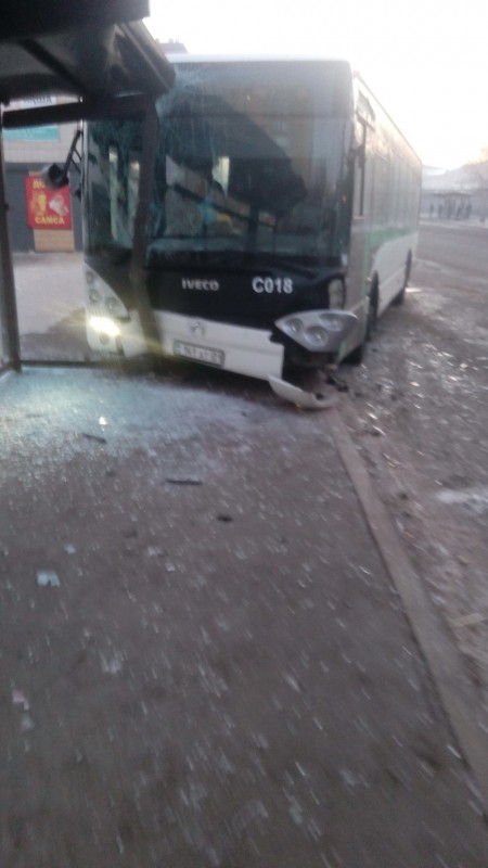 Автобус врезался в остановку после столкновения с другим маршрутным автобусом в Астане, передает корреспондент Tengrinews.kz.