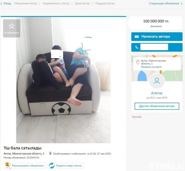 Объявление о продаже трех детей в Актау появилось на одном из местных сайтов. Его заметила местная жительница. Она сообщила об этом журналистам. В объявлении указано, что троих детей продают дешево. Здесь же размещено фото трех мальчиков. Далее, однако, речь идет о продаже дома.