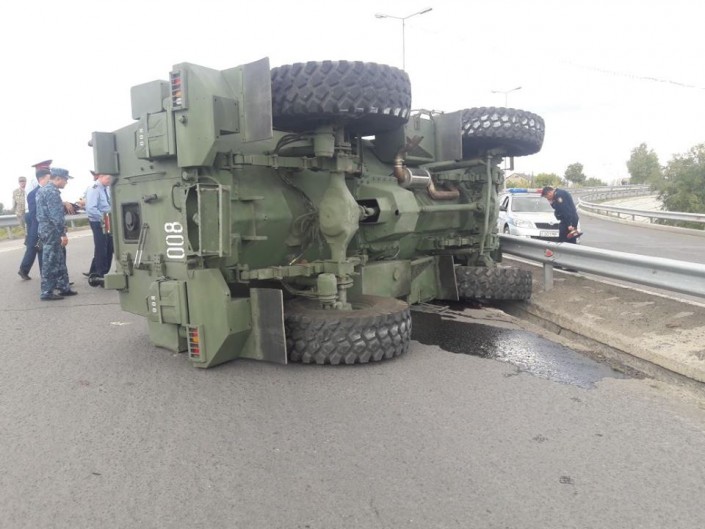 Ранее в соцсетях появились фото с места происшествия. По словам очевидцев, боевая машина БКМ "Арлан" перевернулась, когда колонна военной техники двигалась по кольцу в районе моста.