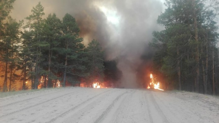 Пламя пожара с неба сбивает вертолет. Как отметили в КЧС, тушение усложняют сильный порывистый ветер и верховой пожар. В настоящее время площадь ориентировочно составляет около 40 гектаров.