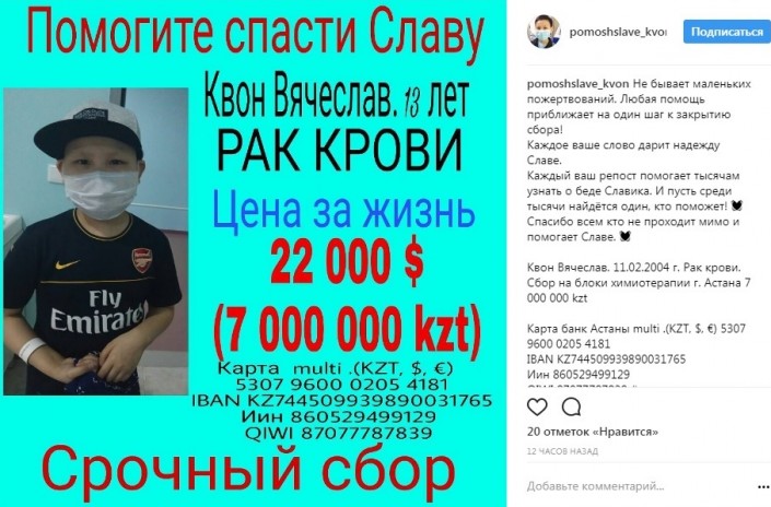 Больному раком крови мальчику отказали в бесплатном лечении в Казахстане 13-летний Вячеслав Квон. Фото Instagram/ Pomoshslave_kvon