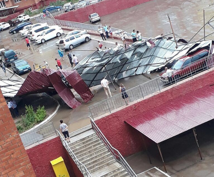 "Батыс 2. Сильный ветер вырвал с корнем стоянки и полетел в сторону дома, разбил машины и балконы жильцов", - пишет в Instagram @gorod_aktobe.