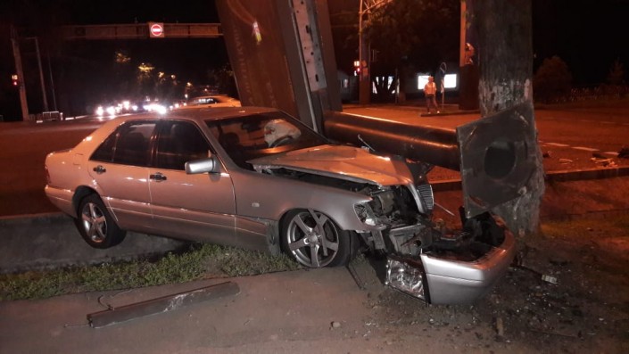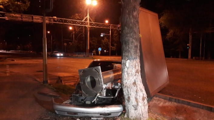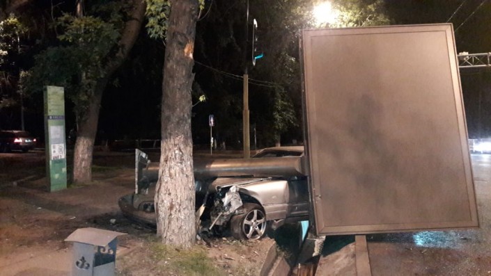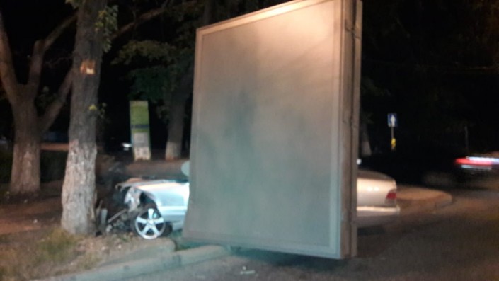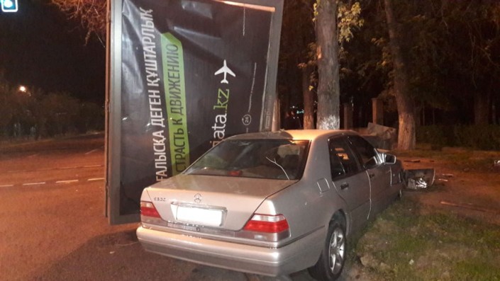Еще одно ДТП произошло на пересечении проспекта Абая с улицей Наурызбай батыра. Mercedes-Benz "кабан" на полном ходу сбил рекламный билборд. Аварию совершил приезжий водитель, судя по всему плохо знающий город. Жизнь ему спасла подушка безопасности.