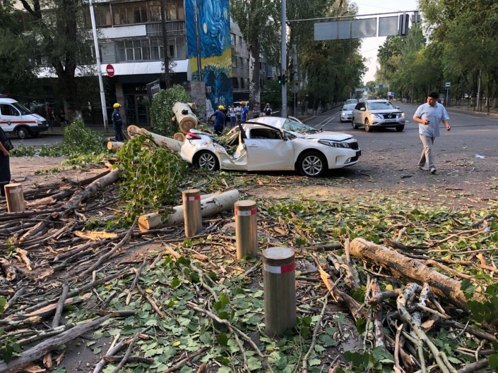 ЧП произошло на пересечении улиц Курмангазы и Кунаева. Огромное дерево рухнуло на авто.