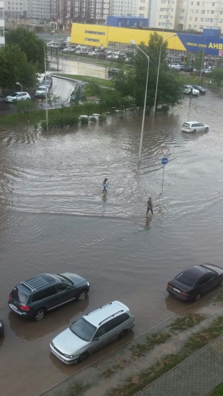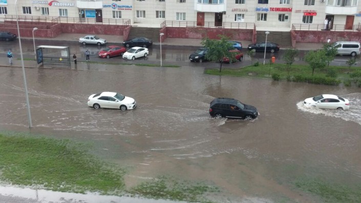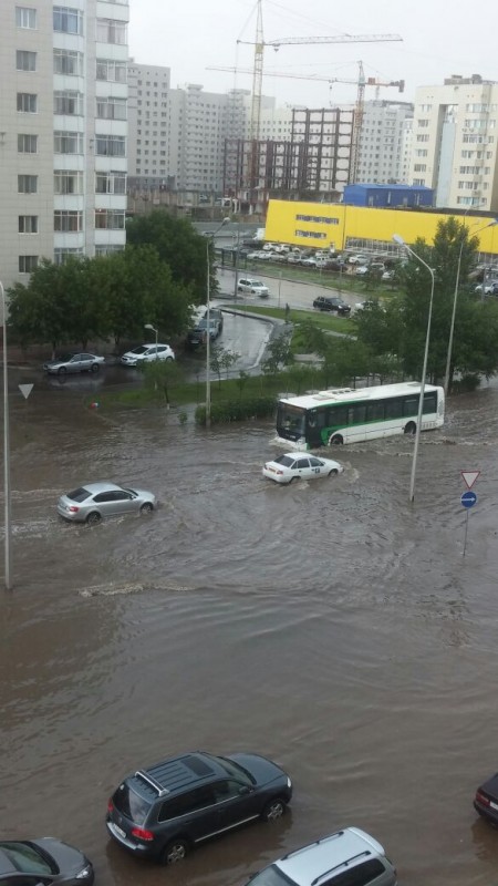 Небо над Астаной затянуло тучами, и начался дождь примерно в 13.30. Из-за обильного количества воды некоторые улицы были затоплены. Пользователи социальных сетей сразу начали выкладывать фотографии происходящего.