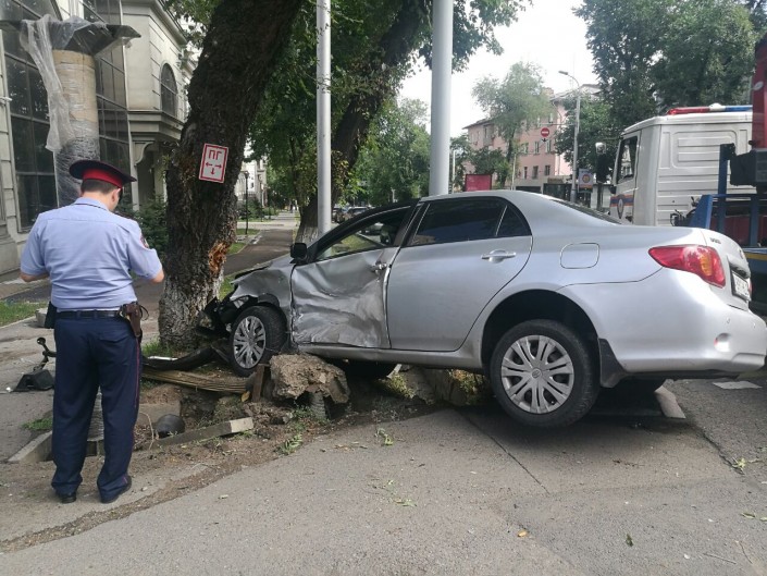 ДТП в центре Алматы: Toyota закрутило и отбросило на светофорный столб