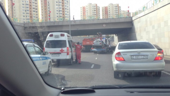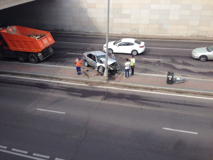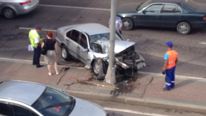 В микрорайоне Самал автомобиль марки BMW серебристого цвета врезался в столб. Передняя часть авто оказалась серьезно повреждена.