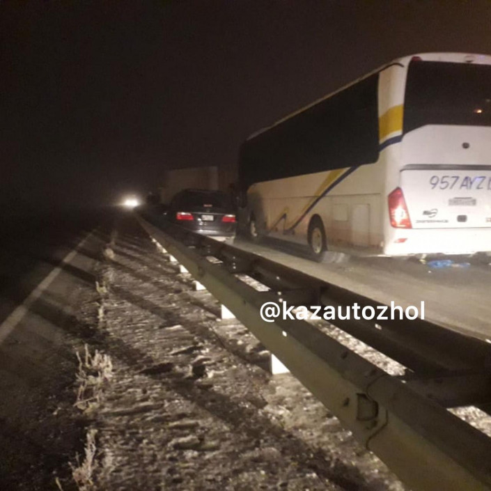 Тем временем два пассажирских автобуса друг за другом направлялись из Тараза в Алматы. Водитель первого автобуса, заметив ДТП, начал тормозить и врезался в боковую часть КамАЗа. Второй же автобус, не соблюдая дистанцию, въехал в первый автобус.