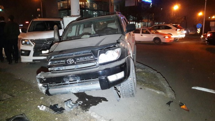 Авария произошла на пересечении улиц Толе би и Яссауи. По словам очевидцев, Toyota 4Runner двигалась по Толе би в восточном направлении в крайнем левом ряду, и водитель хотел повернуть налево. В то же время Lexus поворачивал налево со второго ряда. Произошло столкновение, обе машины улетели на разделительный газон, попутно снеся светофор.