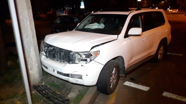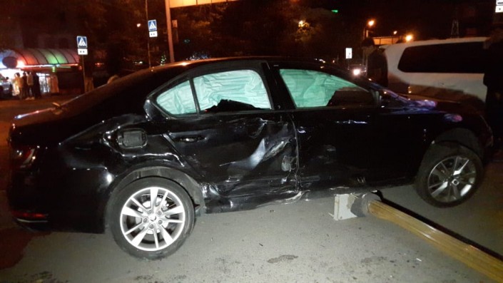 ДТП произошло на перекрестке улиц Манаса и Жандосова. Оба водителя утверждают, что они ехали на зеленый сигнал светофора. Toyota Land Cruiser двигался по Жандосова в восточном направлении, а Skoda ехала в южном направлении по Манаса. В результате столкновения Land Cruiser откинуло в бетонный столб, а автомашина Skoda снесла светофор.