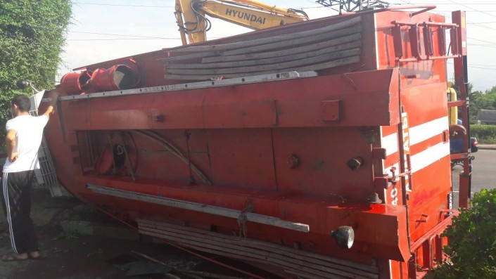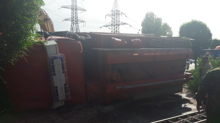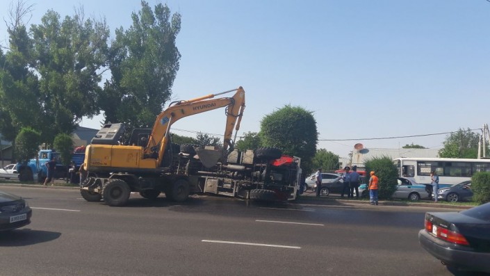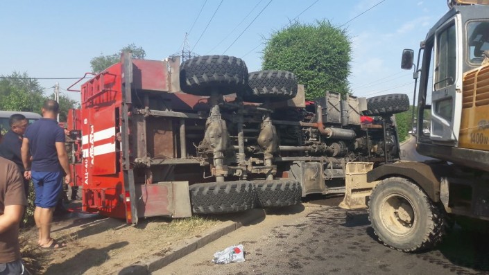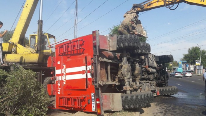 В Алматы пожарная машина, которая ехала на вызов, упала на бок, сообщает корреспондент программы "Территория происшествий" на канале СТВ.