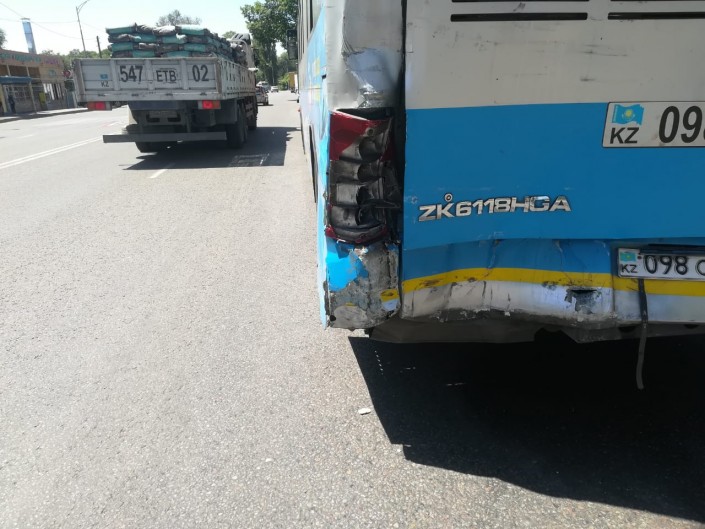ДТП с участием общественного транспорта произошло на проспекте Суюнбая между улицами Бекмаханова и 70-м разъездом (Илийский тракт). Со слов очевидцев, автобус № 29 двигался в южном направлении по проспекту Суюнбая, водитель остановился перед "зеброй", чтобы пропустить пешеходов. В это время за ним ехал грузовик марки Volvo. Водитель фуры врезался в автобус.