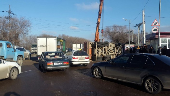 Груженый песчано-гравийной смесью "КамАЗ" и Lаda Kаlina двигались по проспекту Рыскулова в восточном направлении. По неизвестным причинам произошло столкновение большегруза и легкового авто. По всей видимости, от удара "КамАЗ" опрокинулся и содержимое кузова высыпалось на асфальт.