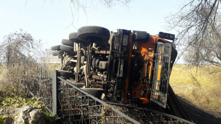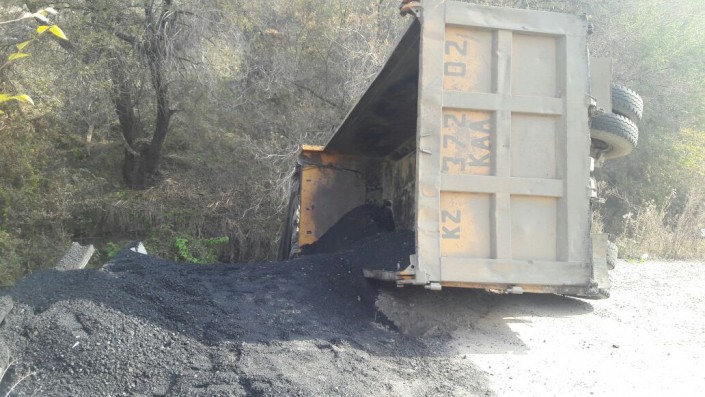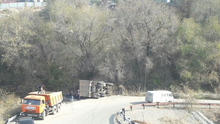 Грузовик с асфальтом опрокинулся в результате ДТП в Алматы, сообщает корреспондент программы "Территория происшествий" на телеканале СТВ.