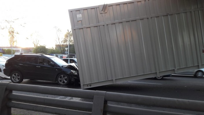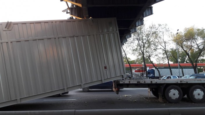 Водитель проезжал по улице Ниязбекова и зацепил контейнером надземный пешеходный переход. Контейнер вывалился с платформы на капот Lexus, следовавшего за грузовой машиной.