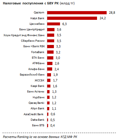 В структуре всех налоговых поступлений три процента приходится на крупные банки второго уровня. Из 36 банков 21 признаны крупными налогоплательщиками. За пять месяцев текущего года они выплатили в бюджет 96 миллиардов тенге, что составляет 58 процентов объема за весь прошлый год. Из них больше половины, или 55 процентов, приходится на Qazkom, сумма уплаченных налогов которого составила 29 миллиардов тенге, и Halyk Bank (24,2 миллиарда тенге).