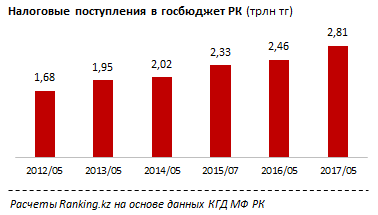За январь-май 2017 года госбюджет пополнился на 2,8 триллиона тенге налоговых поступлений. По сравнению с отчетным периодом прошлого года сборы выросли на 14 процентов. Годовой план исполнен на 42 процента, план текущего периода перевыполнен на 5,3 процента. В том числе подоходный налог составил 986 миллиардов тенге (плюс 6 процентов), внутренние налоги - 991 миллиард тенге (плюс 18 процентов), налог на международную торговлю - 443 миллиарда тенге (плюс 27 процентов), социальный налог - 230,4 миллиарда тенге (плюс 11,3 процента), налог на собственность - 138,3 миллиарда тенге (плюс 17,5 процента).