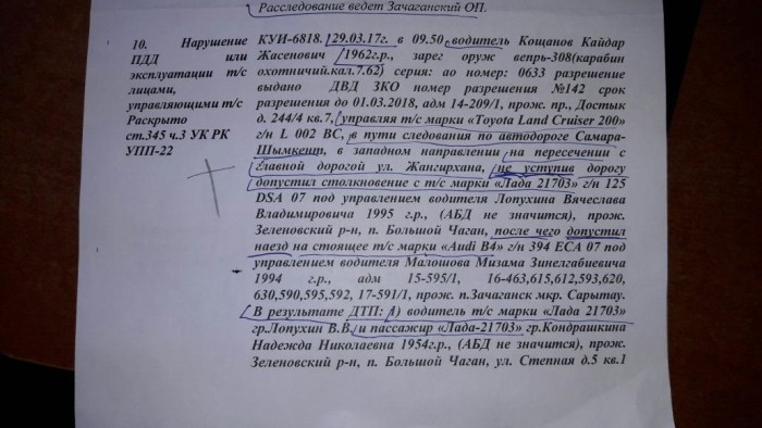Напомним, ДТП, о котором идет речь, произошло утром 29 марта в Уральске на пересечении улицы Жангирхана и объездной дороги. Согласно полицейской сводке, депутат на Toyоta Land Cruiser 200 двигался по второстепенной дороге и не уступил дорогу автомобилю "Лада Приора" под управлением 22-летнего Вячеслава Лопухина, который двигался по главной дороге. В легковушке, кроме водителя, находилась его бабушка - 63-летняя Надежда Кондрашкина.