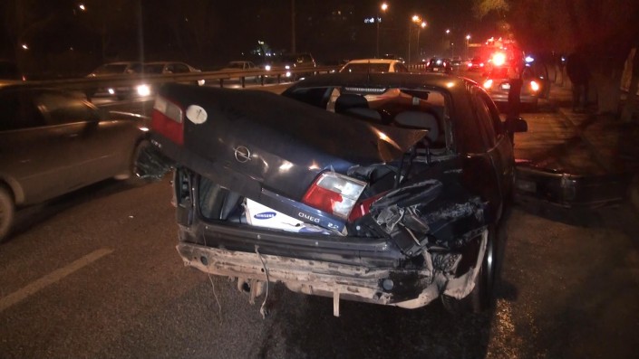 Первая авария произошла по улице Саина, не доезжая до улицы Улугбека. Столкнулись автомобили Opel и Toyota Camry, которые двигались в северном направлении. Как сообщили очевидцы ДТП, водитель Opel не справился с управлением и врезался в разделительное ограждение, после чего отлетел в Toyota Camry. В результате столкновения никто не пострадал.