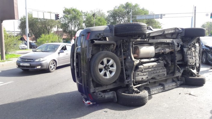 Land Cruiser лег на бок после ДТП на перекрестке в Алматы, сообщает корреспондент программы "Территория происшествий" на телеканале СТВ.