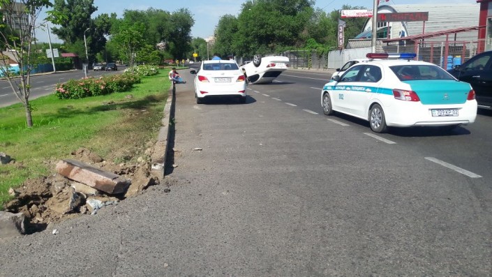 Lexus перевернулся от удара об бордюр в Алматы, передает корреспондент программы "Территория происшествий" на канале СТВ.