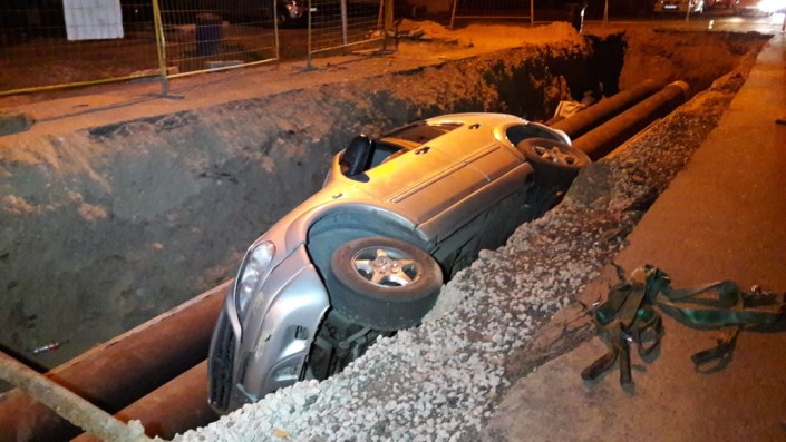 Водитель Mercedes провалился в траншею, где шли ремонтные работы, пытаясь избежать столкновения с подрезавшим его автомобилем, сообщает корреспондент программы "Территория происшествий" на телеканале СТВ.