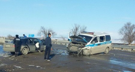По данным полиции, авария произошла в воскресенье 27 декабря на 212-м километре автодороги Алматы - Ташкент. Как оказалось, 46-летний водитель легкового автомобиля Mercedes двигался со стороны села Кордай в Алматы. "В результате обгона впереди движущейся автомашины, не убедившись в безопасности маневрирования, он совершил столкновение с автомашиной Hyundai Н-1, то есть полицейским "Автоураганом", - говорится в сообщении.