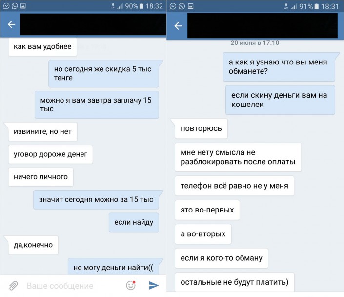 "Предположительная схема такова: в социальной сети "В Контакте" в одной из групп происходит взлом личной страницы одного из знакомых потерпевшего. Далее с этого адресата потенциальной жертве приходит сообщение с просьбой оказать содействие в поиске его сотового телефона iPhone через определенную программу. Таким образом, злоумышленник обманным путем завладевает персональными данными сотового телефона потерпевшего, после чего блокирует его и в дальнейшем вступает с ним в переписку, где предлагает заплатить ему за разблокировку сотового телефона. В ходе переписки мошенник присылает полную инструкцию, то есть, так называемую, тарифную сетку со стоимостью разблокирования мобильного телефона в зависти от модели. Также указывается, что оплату необходимо произвести через электронную платежную систему QIWI", - рассказал о методах мошеннического промысла начальник отдела "К" Управления криминальной полиции ДВД Алматы подполковник полиции Аскар Сысоев.