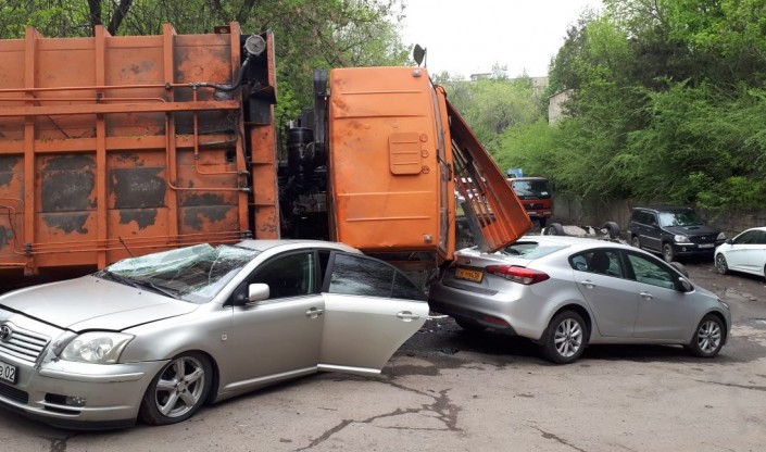 В Алматы КамАЗ-мусоровоз раздавил припаркованные автомобили, сообщает корреспондент программы "Территория происшествий" на телеканале СТВ.