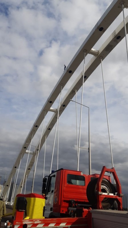 В Нур-Султане неизвестный мужчина поднялся на мост через реку Есиль. Экстренная служба спасения пытается спустить его, передает корреспондент Tengrinews.kz.