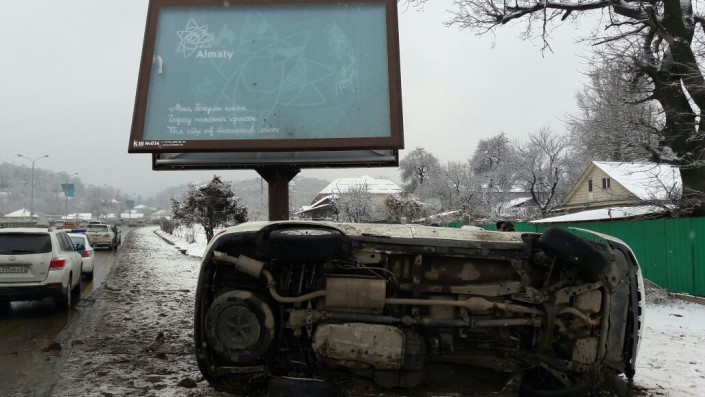 На ВОАД в Алматы произошло ДТП с участием внедорожника, который перевернулся возле рекламного баннера. Об этом корреспонденту Tengrinews.kz сообщили очевидцы.