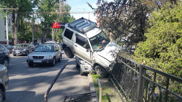 Последствия аварии на пересечении проспекта Абая с улицей Фурманова засняли очевидцы. Одна автомашина оказалась на другой, проломив железное ограждение.