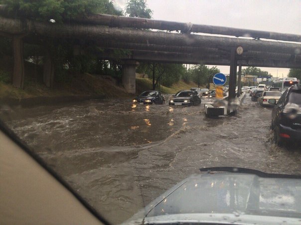 "По Аль-Фараби в обоих направлениях под мостом на Фурманова проезд невозможен, воды по пояс. Легковые машины заглохли и практически перекрыли движение. Корректируйте маршрут", - написал один из пользователей в соцсетях.
