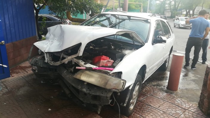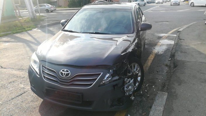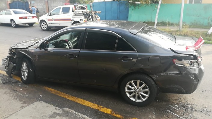 Авария произошла на пересечении улиц Рыскулова и Жандосова в районе верхней Каменки. По словам очевидцев, водитель автомобиля Nissan, двигаясь по Рыскулова, не заметил знак "Уступи дорогу" и выехал на перекресток, где столкнулся с Toyota. От удара Nissan врезался в здание магазина.