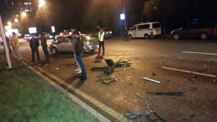 Авария произошла на Аль-Фараби за торговым центром Esentai Mall, перед улицей Шашкина (бывшая улица Университетская). Автомобиль марки BMW 745 двигался в восточном направлении. Водитель авто, не справившись с управлением, на большой скорости вылетел на газон и совершил наезд на препятствие.