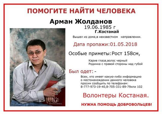 Как сообщили в пресс-службе ДВД Костанайской области, заявление о пропаже Армана Жолданова подал его брат. Оно зарегистрировано в Южном отделе УВД Костаная. Ведутся поиски.