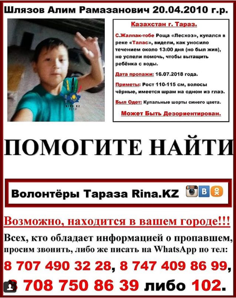 "Тело было найдено сегодня, 18 июля, примерно в 14.00 и извлечено родственниками на расстоянии около 3 километров ниже по реке Талас от места, где его унесло течение", - подтвердила руководитель пресс-службы ДЧС Жамбылской.