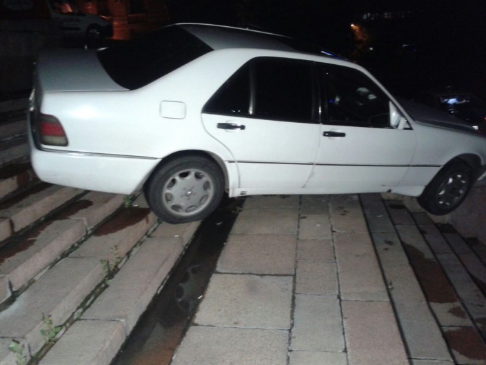 Пьяный водитель автомобиля марки Mercedes-Benz решил спуститься по лестнице у здания Казахстанско-Британского технического университета (КБТУ) в Алматы, сообщает корреспондент программы "Территория происшествий" на телеканале СТВ.