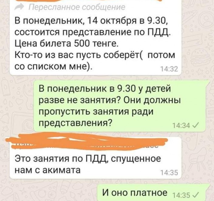 Алматинка опубликовала в социальных сетях переписку с администрацией школы №117, в которой сообщается, что родителям необходимо собрать деньги для представления по ПДД, которое состоится 14 октября в 09.30 часов. Это сообщение возмутило женщину.