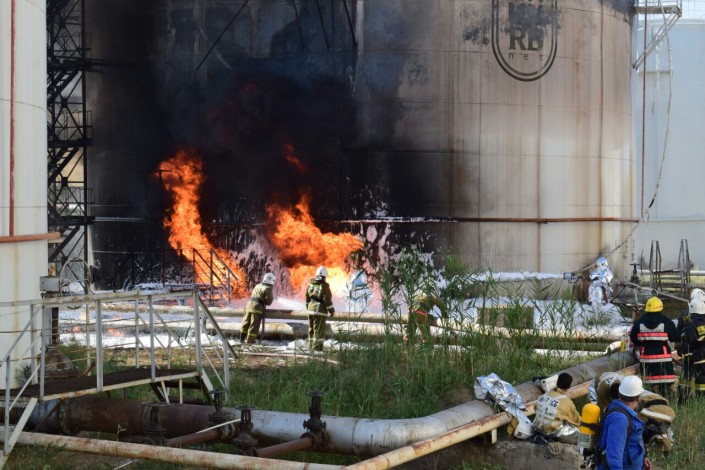 "Необходимо отметить, что произведено пять пенных атак. Из-за высокой температуры и интенсивности огня не давали ожидаемых результатов. После была организована разведка пожара с использованием беспилотного летательного аппарата ("дрон"). Результаты разведки показали, что безуспешность пенных атак обусловлена отсутствием доступа огнетушащих веществ внутрь горящего резервуара в виду наличия незначительных отверстий в деформированной стационарной крыше", - рассказал Иманкулов.