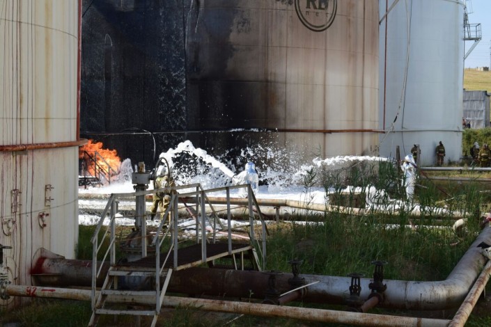 На месте создан оперативный штаб пожаротушения с организацией двух боевых участков для подачи дополнительных водяных стволов на охлаждение и защиту расположенных рядом резервуаров. Организована работа по подготовке пенной атаки.
