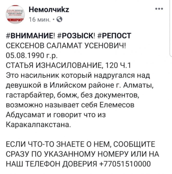 "Это насильник, который надругался над девушкой в Илийском районе Алматинской области, гастарбайтер, бомж, без документов. Возможно, называет себя Елемесов Абдусамат, говорит, что из Каракалпакстана", - говорится в сообщении.