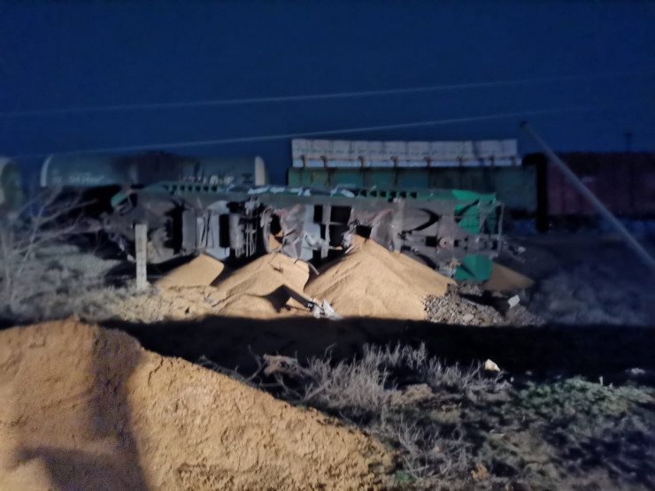 ЧП произошло 7 марта в 23.20 возле села Сайхин. Поезд, груженный зерном, следовал по маршруту Саратов - Астрахань. По предварительным данным, причиной произошедшего стала трещина колесных пар. С рельсов сошли и упали на бок пять вагонов.
