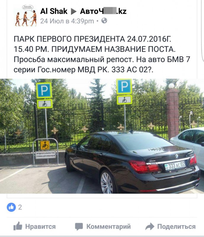 В полиции прокомментировали фото с BMW на парковке для инвалидов в парке Первого Президента в Алматы, сообщает корреспондент Tengrinews.kz.