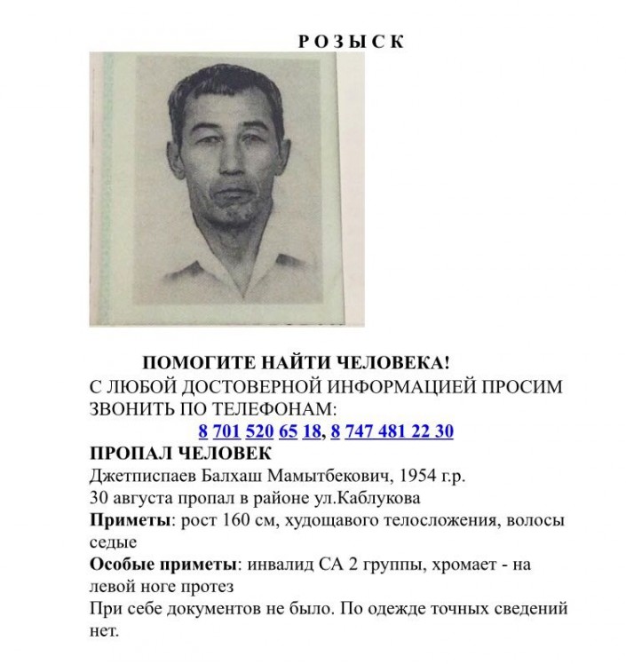 "Пропал мой дядя Джетписбаев Балхаш Мамытбекович, 1954 года рождения. Особые приметы: худощавое телосложение, передвигается с помощью протеза на левой ноге, хромает. Прошу всех, кто, возможно, видел, обладает какой-либо информацией связаться по телефонам +77015206518, +77010269077, +77022609889, +77021698889", -написала на своей странице в Instagram племянница пропавшего мужчины Анель Нурбекова.