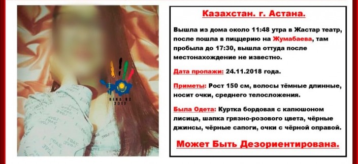 По их данным, 24 ноября 2018 года примерно в 12 часов дня девочка вышла из дома в театр "Жастар", затем она отправилась в пиццерию по улице Жумабаева. Там она пробыла до 17.30, дальше ее местонахождение неизвестно.