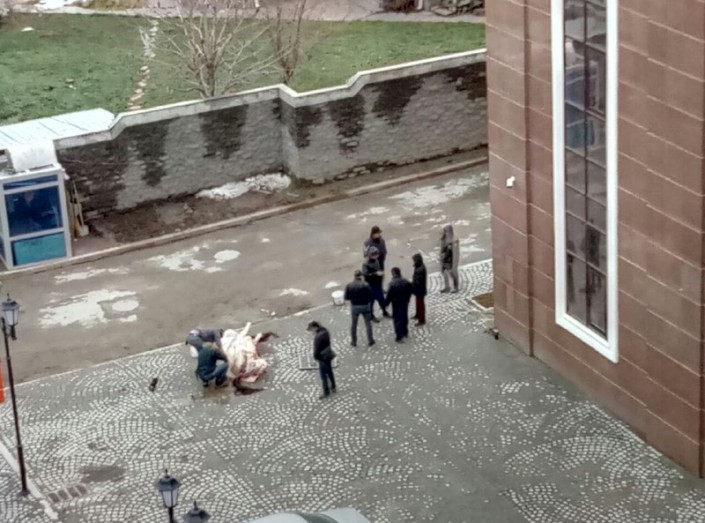 Случай произошел в районе проспекта Достык, ниже проспекта Аль-Фараби, на улице Армянская близ нового бизнес-центра. "Животное привезли на "Газели", оно еще было живым. Некоторое время пытались ее вытащить из кузова, лошадь сопротивлялась. Потом, через полчаса, выглядываю снова на улицу, а животное уже разделывают. По всей видимости, это рабочие бизнес-центра. Они встали буквально на тротуаре рядом с проезжей улицей и начали разделывать тушу. Может, там и праздник какой-то у них, но это выглядело дико. Можно было бы зайти за здание, придумать что-нибудь, но не прям же так", - рассказал очевидец.
