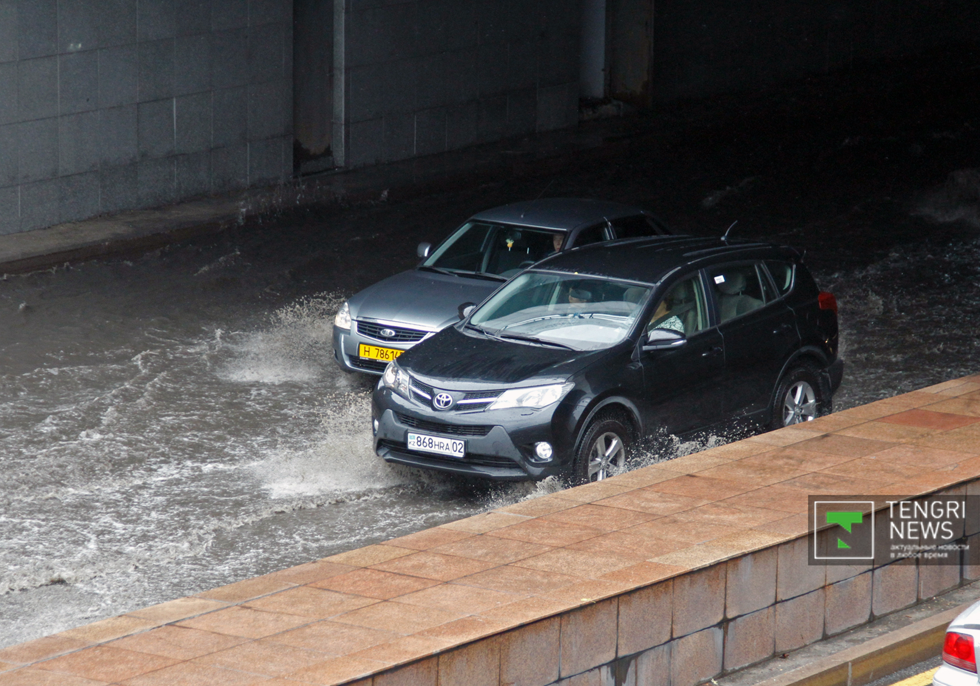 "По Аль-Фараби в обоих направлениях под мостом на Фурманова проезд невозможен, воды по пояс. Легковые машины заглохли и практически перекрыли движение. Корректируйте маршрут", - написал один из пользователей в соцсетях.