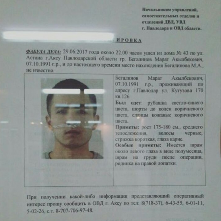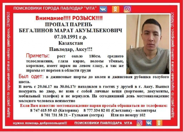 "Со слов друзей Марата, знаем, что в день пропажи он гостил у них в Аксу. Вместе с Маратом были три друга с девушками. Компания отдыхала на квартире одной из них. Молодые люди пили пиво, развлекались. Затем двое друзей с подругами вышли в магазин. Марат остался на квартире с другом и его девушкой. Они вышли во двор, сидели на лавочке, общались. Потом, со слов пары, Марат встал, сказал, что ему надо покурить, и ушел", - рассказывает сестра пропавшего Сауле Бегалинова.